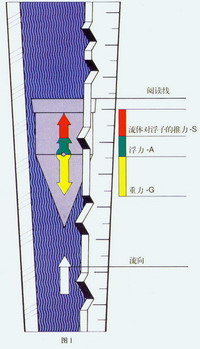 浮子式流量計(jì)是一種變面積式流量計(jì),它通常具有一段直立的錐管和一只可以在其中自由的隨流量大小上下移動(dòng)的浮子(如圖1)。當(dāng)流體自下而上流經(jīng)錐管時(shí),流體的動(dòng)能在浮子上產(chǎn)生的推力S和流體的浮力A使浮子上升。隨著錐管內(nèi)壁與浮子之間的環(huán)形流通面積增大,流體動(dòng)能在浮子上產(chǎn)生的推力S隨之下降。當(dāng)推力S與浮力之和等于浮子自身重力G時(shí),浮子處于平衡,并穩(wěn)定在某一高度上,該高度位置對(duì)應(yīng)的刻度指示流過(guò)流量計(jì)的流量。